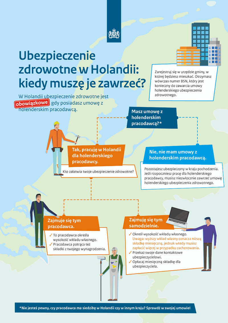 Jeśli przyjeżdżasz do Holandii, by tu mieszkać i pracować dla holenderskiego pracodawcy, masz prawny obowiązek posiadania holenderskiego ubezpieczenia zdrowotnego. Czasem formalności związane z ubezpieczeniem zdrowotnym załatwia pracodawca albo agencja pracy tymczasowej. Wówczas pracodawca przekazuje Ci dokumenty ubezpieczeniowe: polisę i kartę ubezpieczenia. Nie musisz mieć tych dokumentów przy sobie, aby otrzymać pomoc medyczną w Holandii (wystarczy, że podasz swojemu lekarzowi swoje nazwisko i numer BSN).